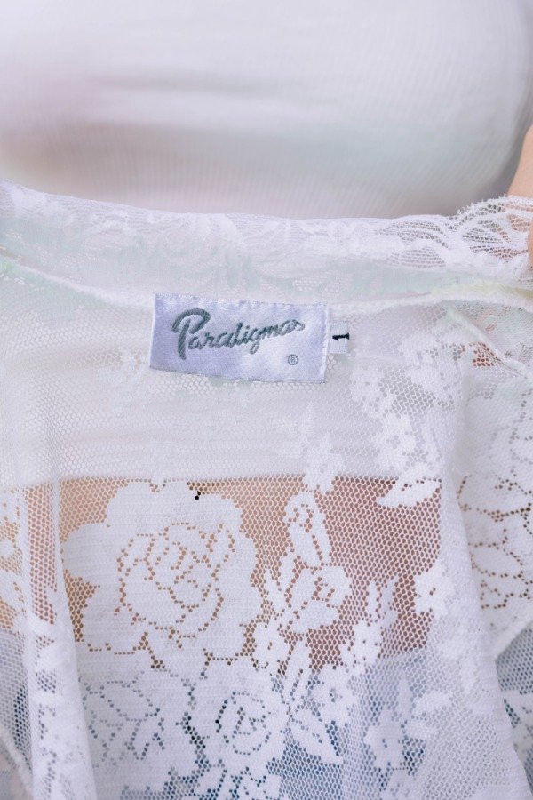 Camperita todas de encaje tul y puntilla, espalda full blanco, por delante el cierre y algunos apliques en seda con tonos rosas
